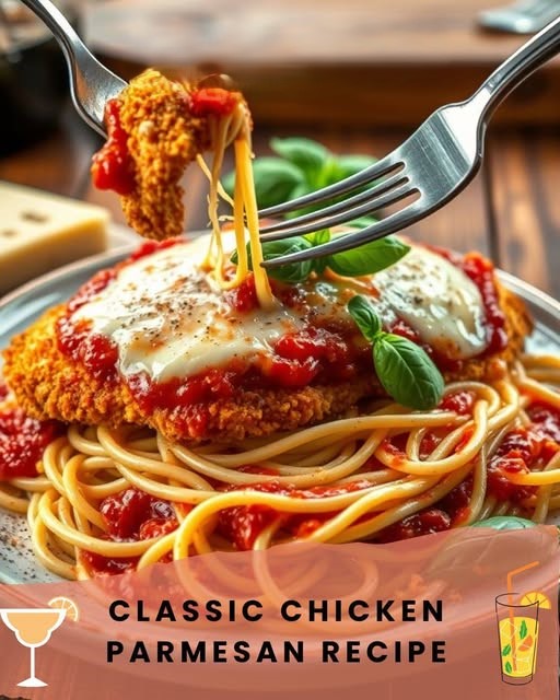 Classic Chicken Parmesan 🍗✨ is a timeless Italian-American favorite featuring crispy breaded chicken cutlets, rich marinara sauce, and a golden, gooey layer of melted mozzarella and Parmesan cheese. This hearty dish is perfect for a comforting family dinner or a crowd-pleasing main course. Serve it with pasta, garlic bread, or a fresh salad for a complete, satisfying meal!